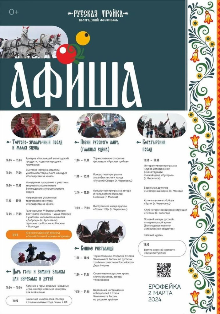 2 марта 2024 года в деревне Ерофейка Вологодского округа состоитсяфестиваль «Русская тройка» с обширной концертной программой, ярмарочными рядами и русскими военными забавами.