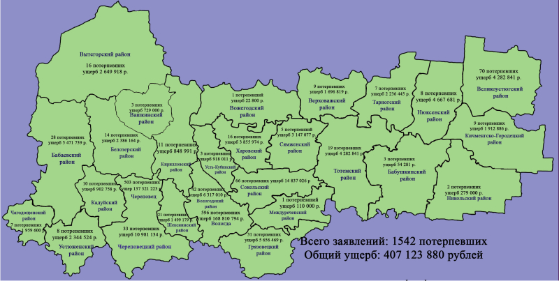 19 июля 2023 года пресс-служба управления МВД России по Вологодской области обнародовала карту региона со статистикой совершенных дистанционных мошенничеств.