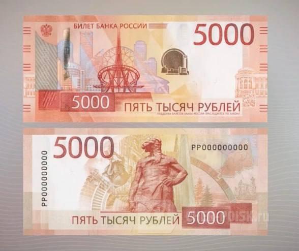 Пяти тысячная банкнота посвящена городу Екатеринбургу и Уральскому федеральному округу. Основное изображение на лицевой стороне - это стела "Европа-Азия", а на оборотной стороне мы видим памятник "Сказ об Урале" в Челябинске и стелу "66-параллель" (Полярный круг) в Салехарде.