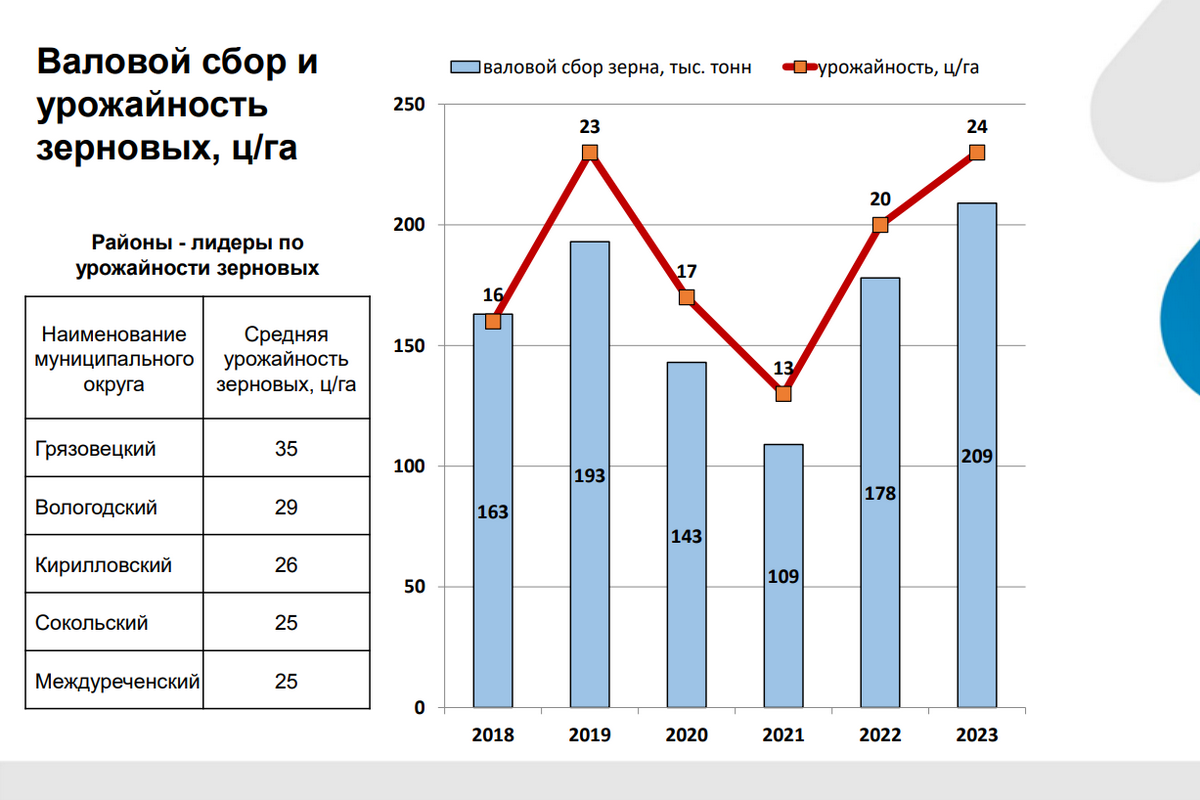 Аграрии Вологодчины полностью завершили уборку зерновых культур. В этом году валовый сбор зерна составил 209 тысяч тонн при средней урожайности 24 центнера с гектара. Обе цифры являются рекордными за последние семь лет.