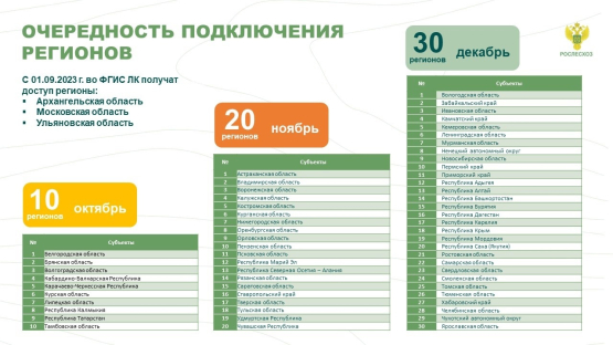 С 1 сентября в системе начнут работать 3 субъекта - Архангельская, Московская и Ульяновская области. В октябре в ним присоединится ещё 10 регионов, в ноябре - 20, а в декабре - 30.