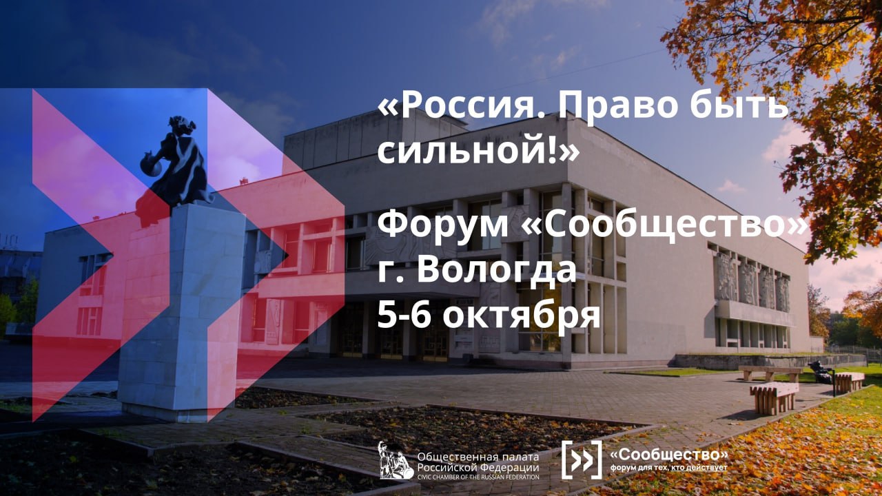 Напомним, форум «Сообщество» проводится с 2015 года. Это открытая площадка для диалога между обществом, бизнесом и властью. В прошлом году заявка Вологодской области на проведение окружного форума прошла отбор в Общественной палате РФ. Его тема для Северо-Запада определена как «Россия. Право быть сильной!». Участники обсудят роль гражданского общества в укреплении суверенитета страны, диалога с органами власти по приоритетным направлениям сотрудничества.