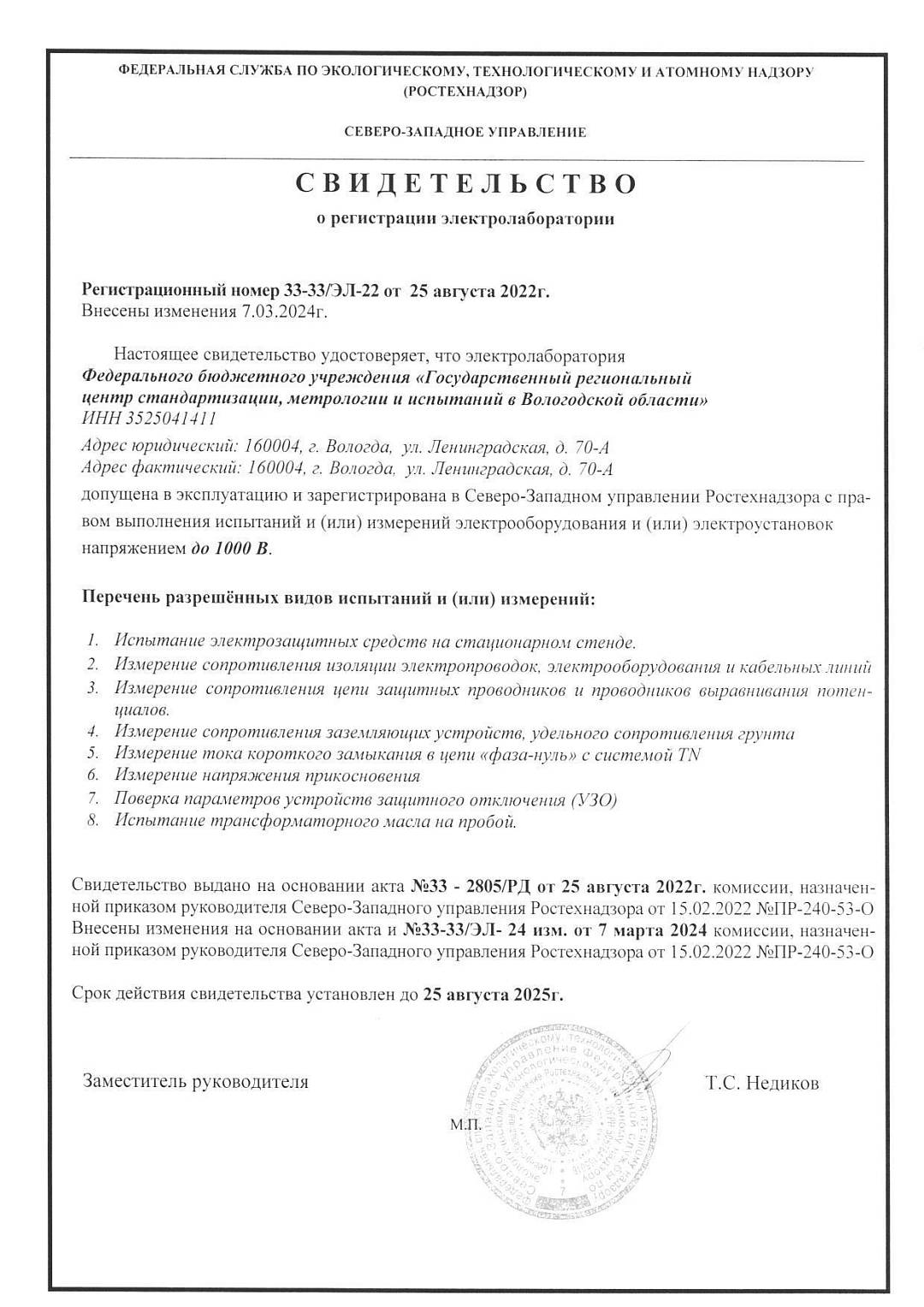 ФБУ «Вологодский ЦСМ» расширил перечень услуг, оказываемых электролабораторией. Электролаборатория ФБУ «Вологодский ЦСМ» успешно прошла процедуру внесения изменений в действующее свидетельство о регистрации №33-33/ЭЛ-22 от 25.08.2022 года. В результате, перечень оказываемых услуг дополнен новым видом работ – испытания трансформаторного масла на пробой. Это позволит упростить процедуру аттестации высоковольтного испытательного оборудования в соответствии с ГОСТ Р 8.568-2017 для заказчиков.
