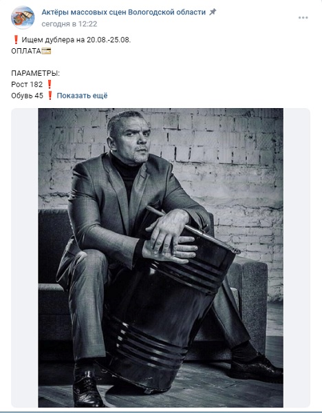 В группе «Актеры массовых сцен Вологодской области» появилось объявление о том, что срочно разыскивается брутальный вологжанин ростом 182 см, который будет дублировать актера Владимира Епифанцева в новом проекте, съёмки которого вот-вот стартуют на Вологодчине