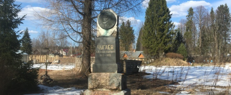 На полпути к санаторию по левой руке – неогороженная могила с надгробием, увенчанным большим медальоном с отлитым из металла портретом. Читаем золотые буквы надгробного памятника: «Лев Александрович Чугаев. 1873-1922».