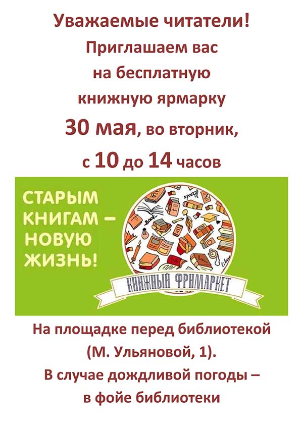 Большая бесплатная книжная ярмарка (фримаркет) пройдет во вторник, 30 мая , на территории перед центральным зданием Вологодской областной универсальной научной библиотеки (М. Ульяновой, 1).