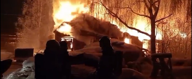 Принтскрин видео телеканала "Руский Север" Как сообщают пожарные, горит здание по адресу Советский проспект, д. 271, где в последнее время располагалась кузница.