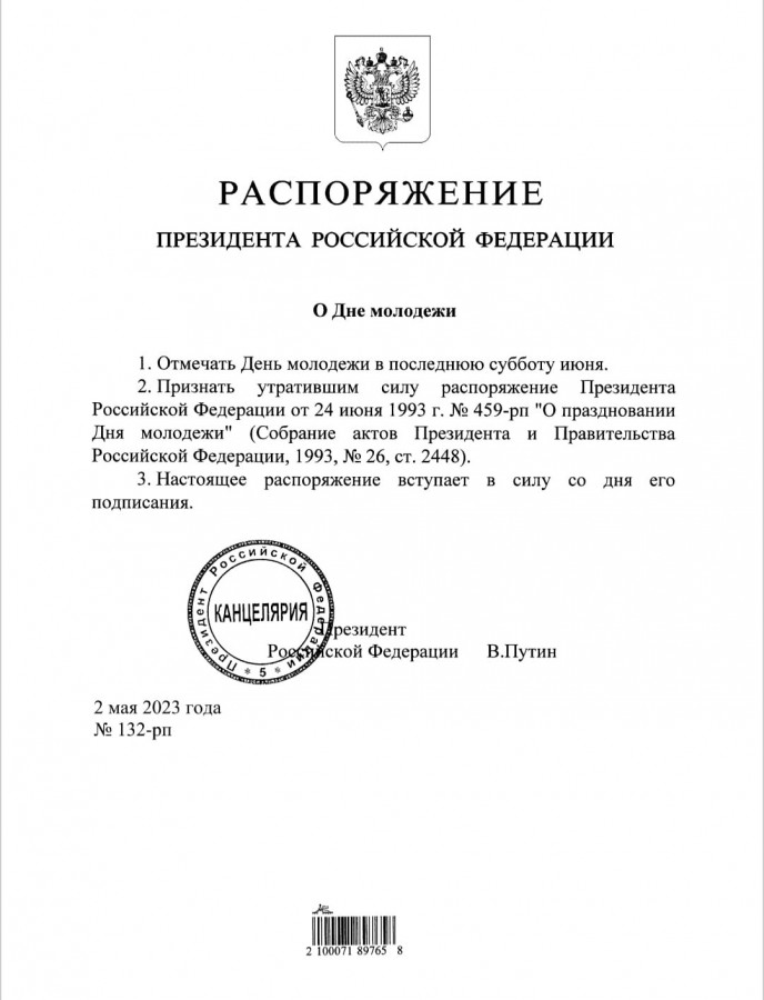 «Отмечать День молодежи в последнюю субботу июня», — говорится в документе, опубликованном на портале правовой информации.