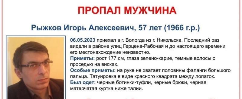 В Вологде пропал 57-летний мужчина, страдающий эпилепсией. Рыжкова Игоря Алексеевича не могут найти с 6 мая. В день пропажи он выехал из Никольска в Вологду, в последний раз мужчину видели в районе улиц Герцена-Рабочая.