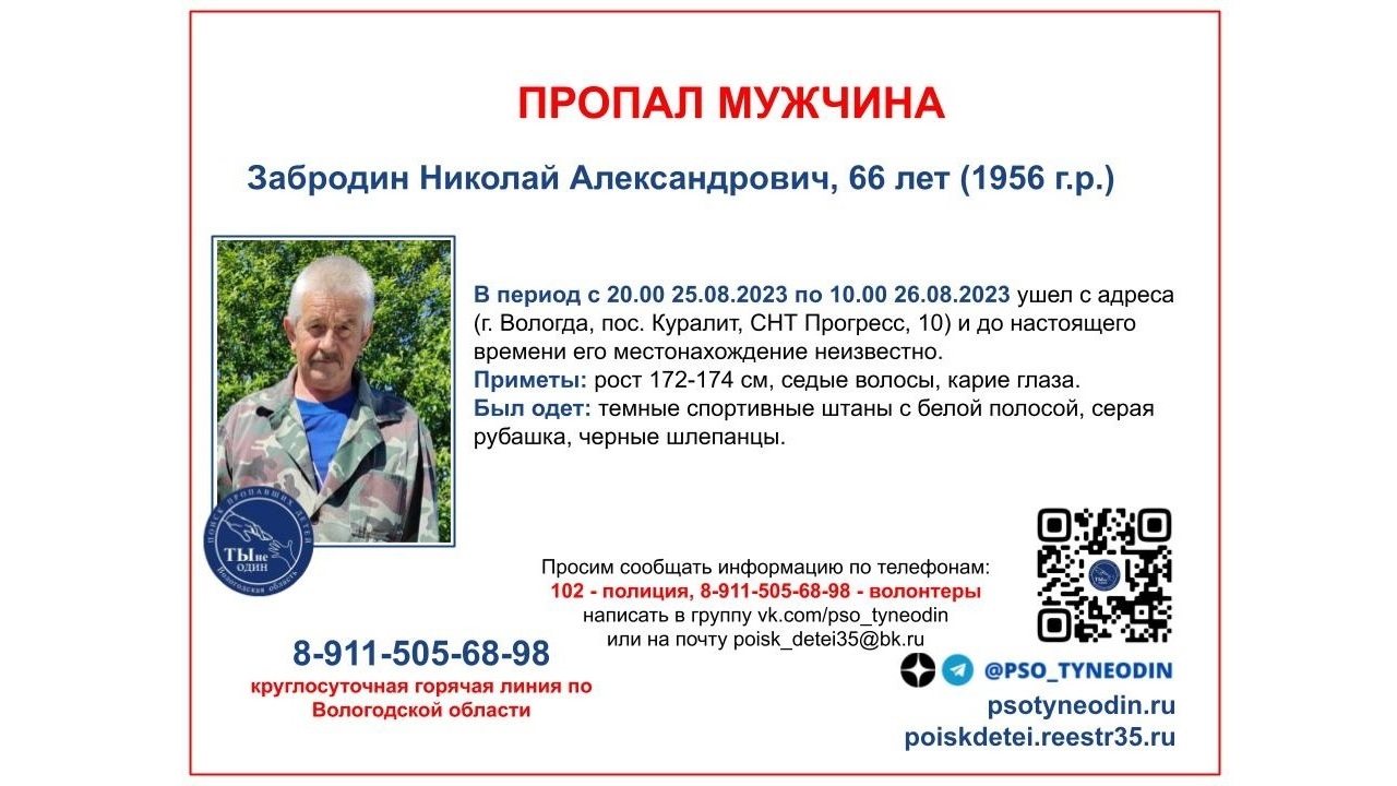 Если вы знаете о местонахождении вологжанина, просьба сообщить в полицию: 102 или волонтерам ПСО «Ты не один» (номер телефона – 8-911-505-68-98, почта – [email protected] ).