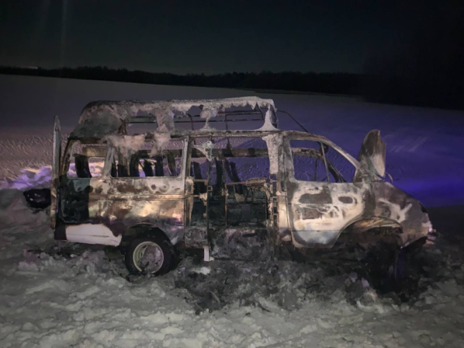 От удара микроавтобус выбросило в кювет, после чего он вспыхнул и полностью выгорел изнутри.