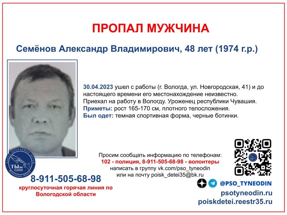 В Вологде 30 апреля пропал 48-летний Александр Владимирович Семенов. Он ушел с работы по адресу ул. Новогородская, 41, и куда-то пропал.