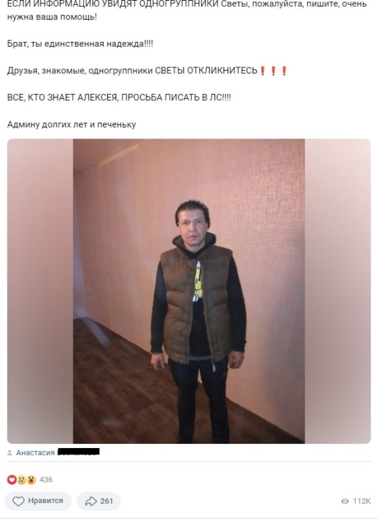 «Разыскивается Мосин Алексей, 1989 г. р. Леша! Погибла твоя сестра Мосина Светлана! Хоронить ее некому! Отзовись! Девчонка добрая, отзывчивая! Училась в ПУ-15 Народных промыслов (ныне губернаторский колледж). Если информацию увидят одногруппники Светы, пожалуйста, пишите, очень нужна ваша помощь! Брат, ты - единственная надежда! Друзья, знакомые Светы, откликнитесь! Все, кто знает Алексея, просьба писать в личные сообщения!»