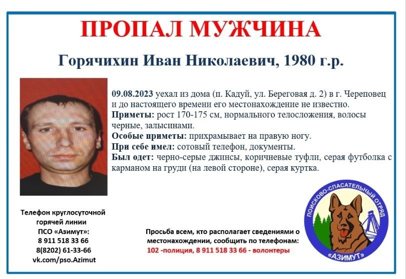 43-летний Иван Горячихин пропал по пути из Кадуя в Череповец. По данным ПСО «Азимут», все произошло еще 9 августа. С тех пор о мужчине нет никаких сведений.
