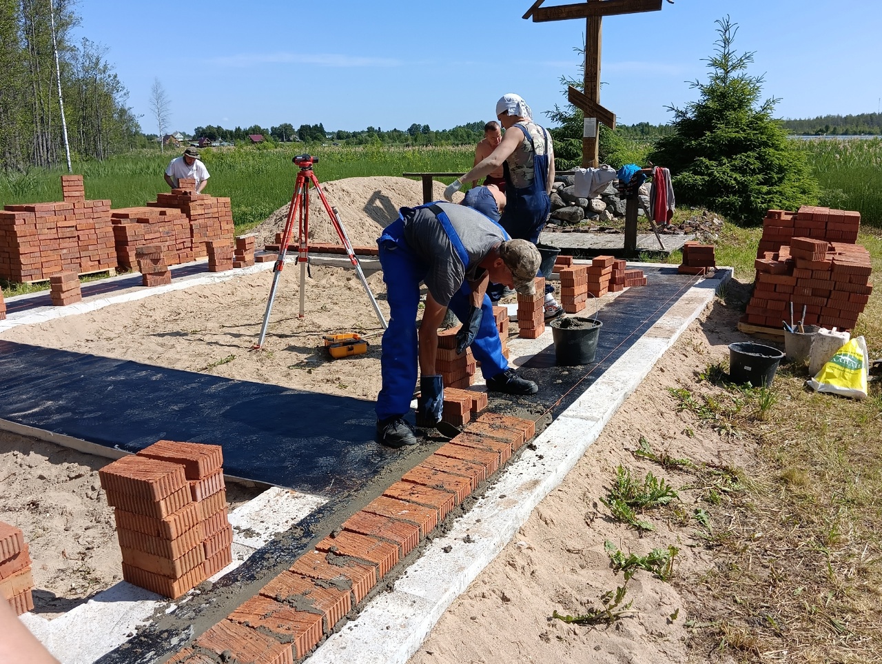 Все стройматериалы перевозятся на остров лодками. Для выкладки основания потребовалось 10 тонн кирпича и два камаза песка. В транспортировке и закладке цоколя участвовало около 30 человек.