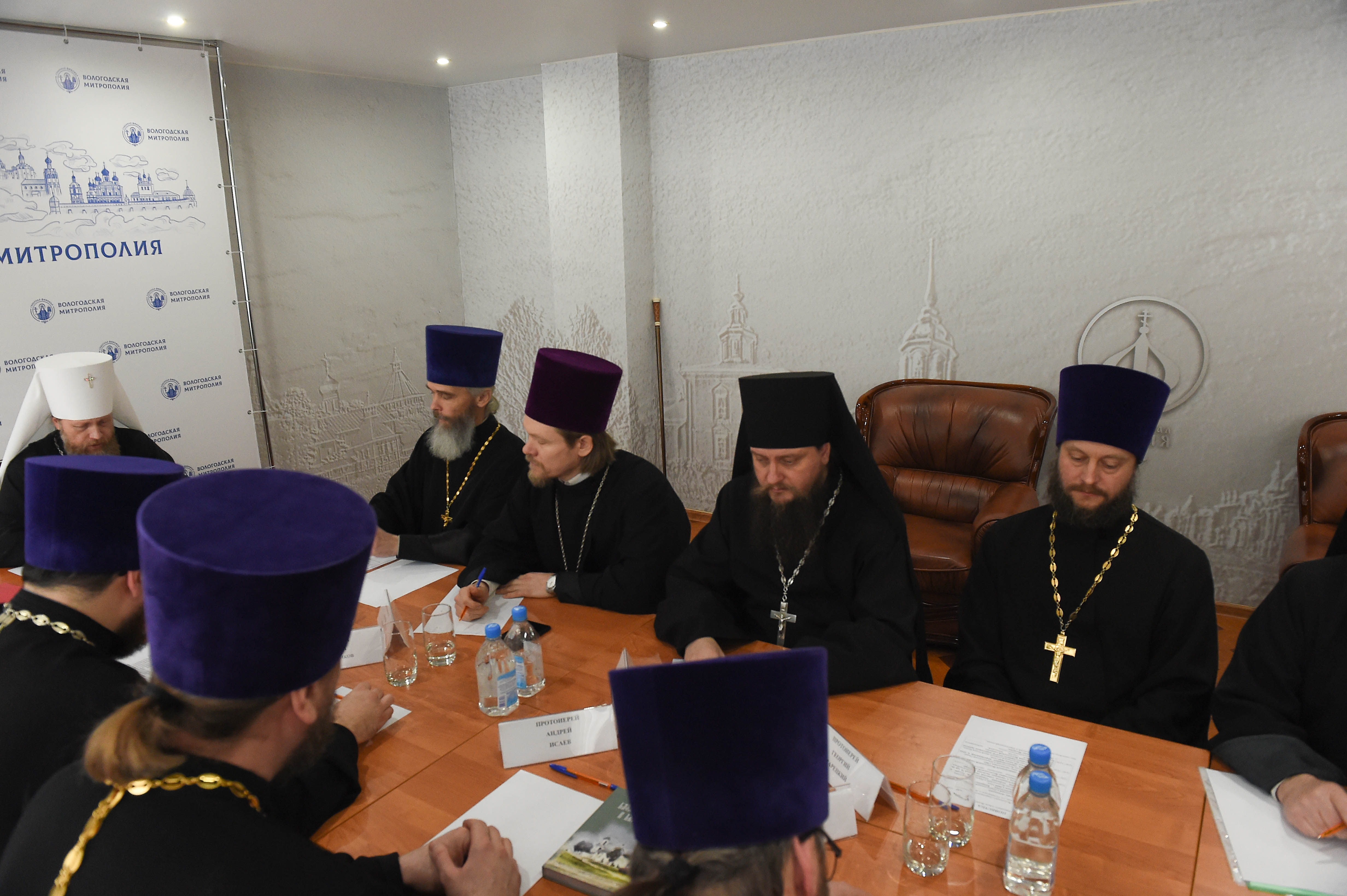 секретарь Вологодского епархиального управления иерей Роман Попов ; ректор Вологодской духовной семинарии протоиерей Алексий Ольховников ; благочинный монастырей Вологодской епархии игумен Иоасаф (Вишняков) ; благочинный Центрального церковного округа города Вологды иерей Сергий Ермолаев ; благочинный Вологодского Северо-Западного округа протоиерей Андрей Смирнов ; благочинный Северо-Восточного (Зареченского) церковного округа города Вологды протоиерей Андрей Исаев ; благочинный Междуреченского церковного округа иеромонах Кирилл (Биденко) ; благочинный Сокольского церковного округа протоиерей Анатолий Балясин ; благочинный Кирилловского церковного округа протоиерей Владимир Колесов; благочинный Сямженского церковного округа протоиерей Михаил Никифоров ; благочинный Харовского и Вожегодского церковных округов протоиерей Анатолий Савчук ; благочинный Верховажского церковного округа протоиерей Александр Мухорин ; благочинный Грязовецкого церковного округа иерей Андрей Сауткин ; благочинный Усть-Кубинского церковного округа иерей Михаил Пинаев ; секретарь Епархиального совета иерей Игорь Шипицын ; руководитель юридического отдела Вологодской епархии протоиерей Георгий Зарецкий .