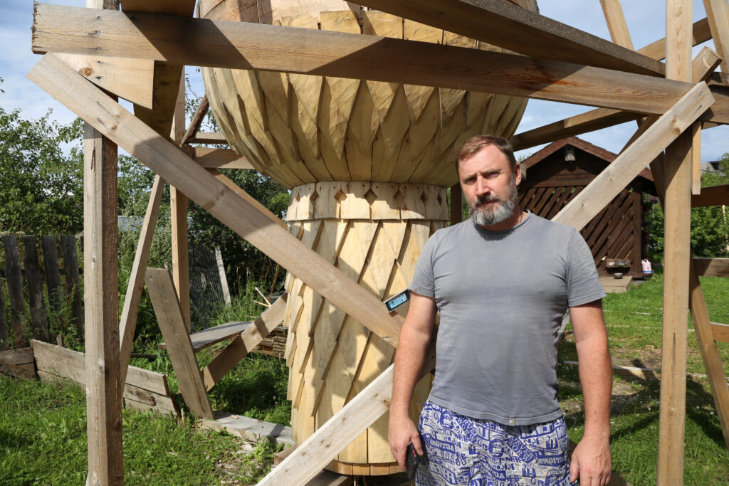 – А это, можно сказать, моя домашняя работа. На реставрации мы работаем вахтами, обычно всё на месте, а главку я решил делать в межвахтовый период, дома, так удобнее, не нужно искать дополнительную площадку, в мастерской у меня есть все необходимые инструменты, есть и кузница. Сейчас покрываю главку лемехом.