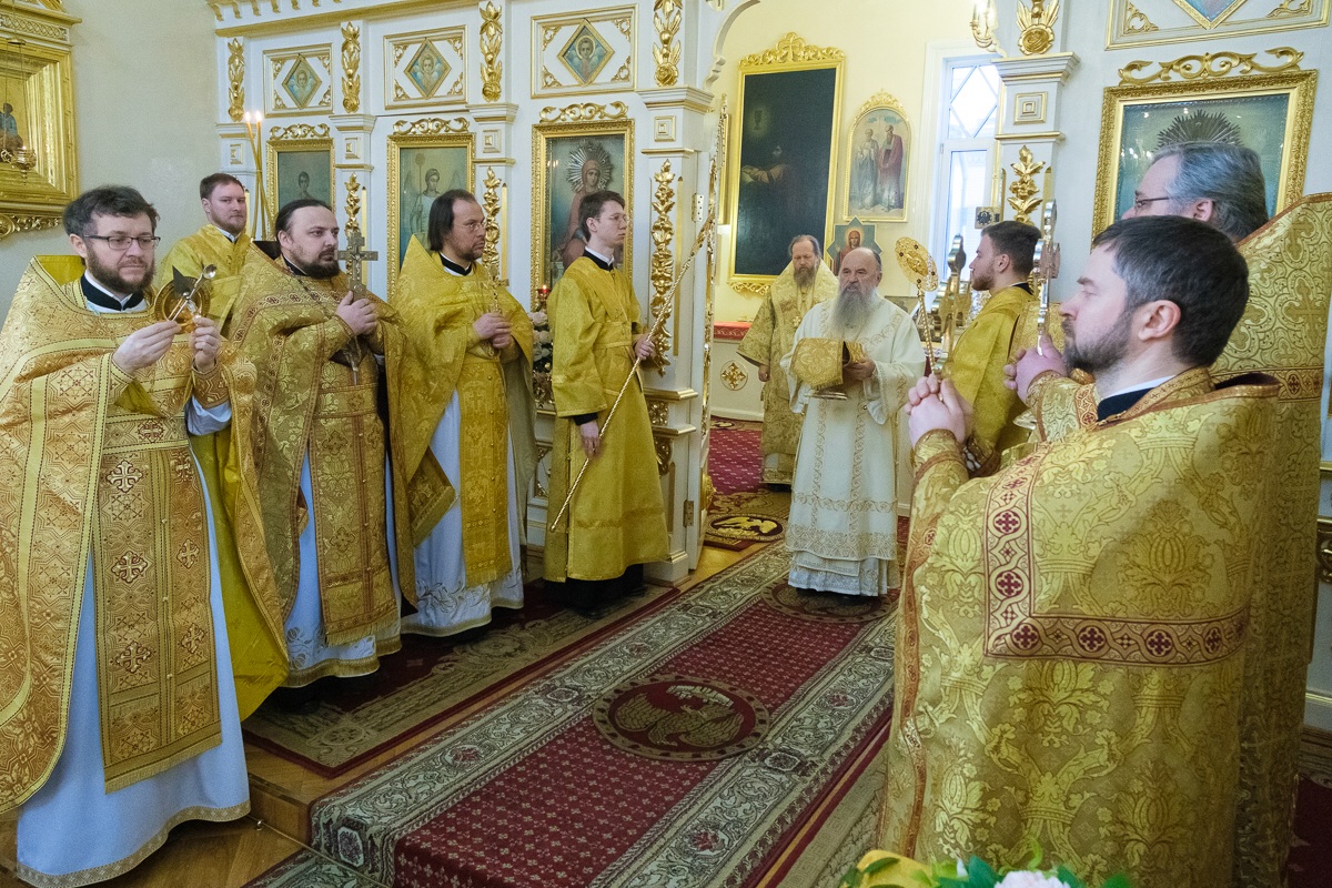 Было совершено славление святителям Василию Великому, Григорию Богослову и Иоанну Златоусту, а также священномученику Ипполиту, епископу Остинскому.
