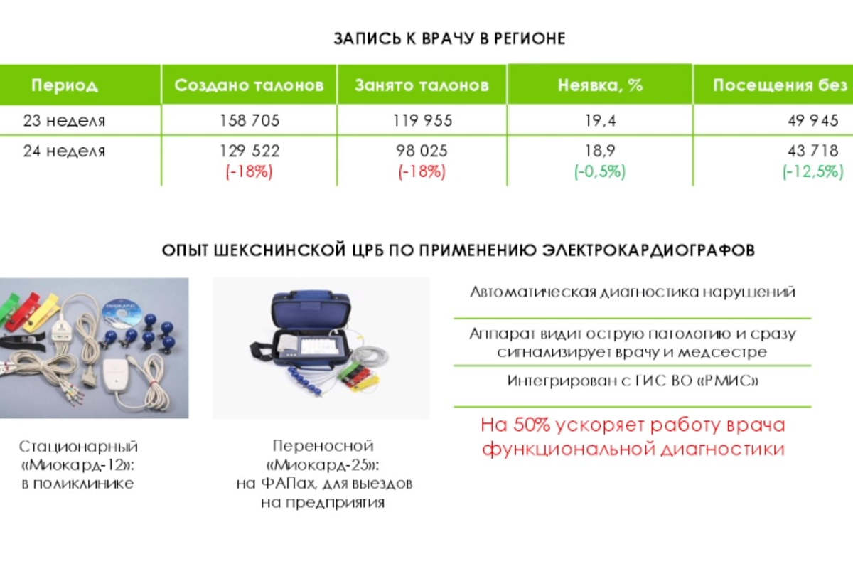 В Шекснинской ЦРБ начали применять метод электрокардиографии, в том числе с использованием искусственного интеллекта. Для этого приобретена соответствующая аппаратура. Больница выбрана пилотной в рамках реализации проекта «Борьба с сердечно-сосудистыми заболеваниями». Об этом рассказали на оперативном совещании в правительстве области под руководством врио губернатора Георгия Филимонова.