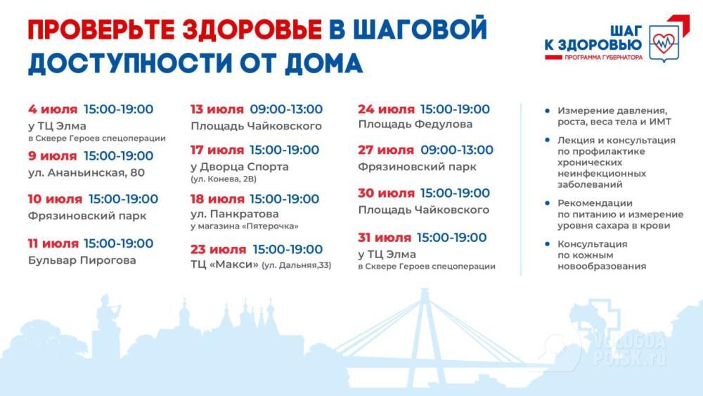 Так, в июле на разных площадках в Вологде откроются городки здоровья, где любой прохожий сможет измерить артериальное и внутриглазное давление, рост, вес и индекс массы тела, проверить уровень сахара в крови, показать врачу кожные новообразования, проконсультироваться по питанию и задать вопросы по хроническим заболеваниям.