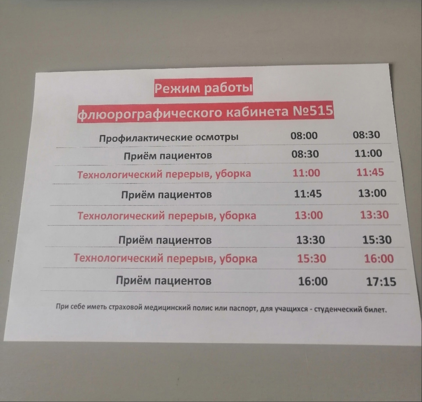 С 10 ОКТЯБРЯ каб. № 515 (флюорография) работает по будням с 08.00 до 17.15.