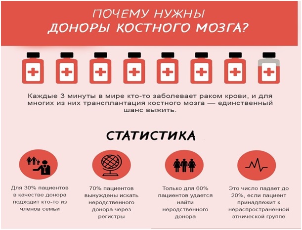 Доноры костного мозга необходимы людям, страдающим злокачественными заболеваниями крови. Помочь им сохранить жизнь и вернуть здоровье может только пересадка клеток костного мозга. Современное здравоохранение обеспечивает незначительную часть от реальной потребности в донорах костного мозга. Но в связи с развитием современных технологий массовое развитие донорства костного мозга стало возможным в первую очередь среди доноров крови, даже несмотря на то, что донорство костного мозга гораздо сложнее, чем донорство крови. Шанс совместимости донора костного мозга и реципиента очень мал, по статистике 1 на 10000 подборов; куда проще найти людей с одинаковой группой крови и резус фактором. Для поиска донора костного мозга приходится обращаться за границу, на что тратится много времени и средств. Не у всех есть такие возможности, а главное время. Для этого была создана единая база доноров костного мозга в России – Федеральный регистр.