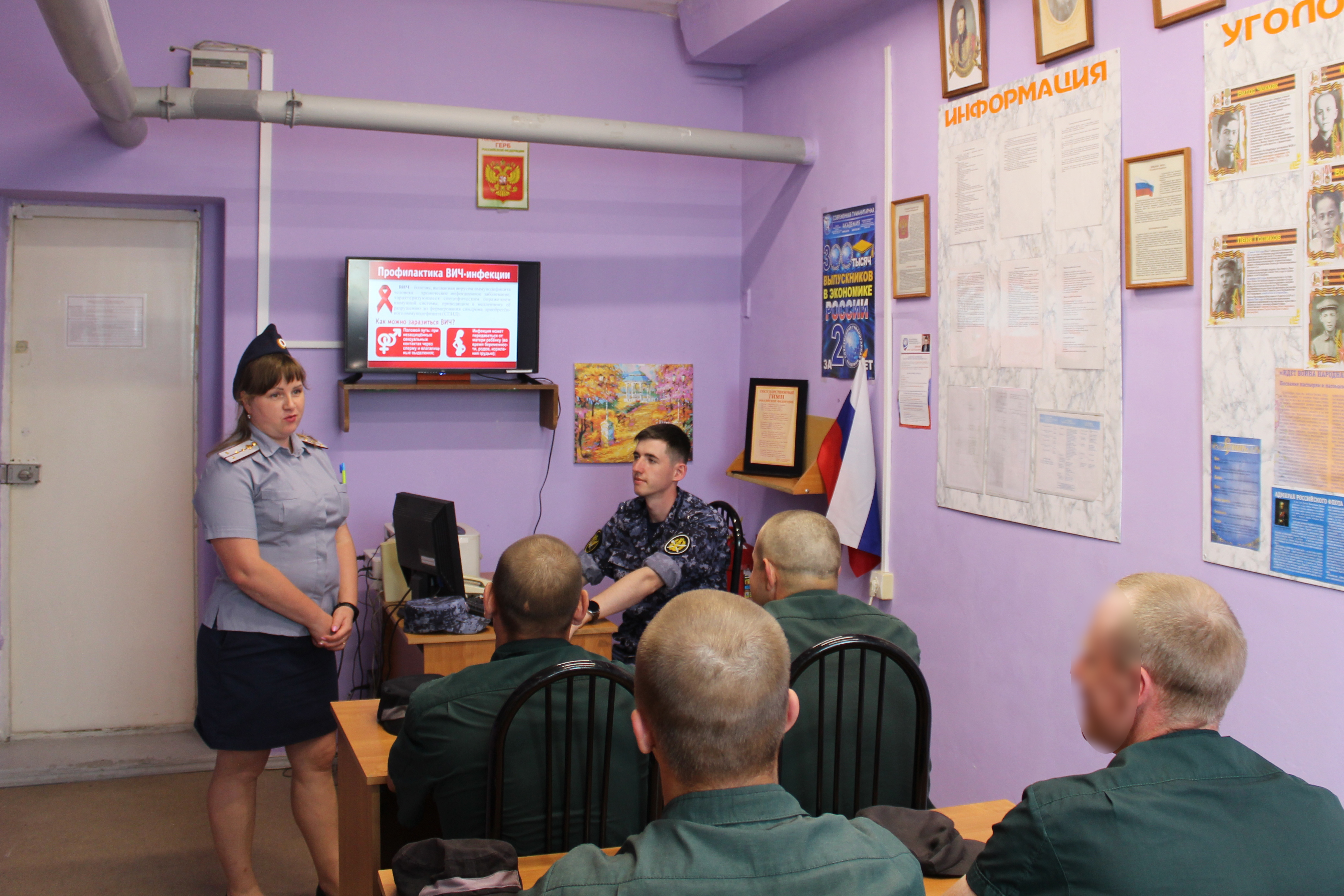Сотрудники воспитательного отдела следственного изолятора № 3 совместно с медицинскими работниками филиала медицинской части № 9 ФКУЗ МСЧ-35 ФСИН России провели для осужденных отряда по хозяйственному обслуживанию лекцию по профилактике распространения ВИЧ-инфекции и СПИДа.
