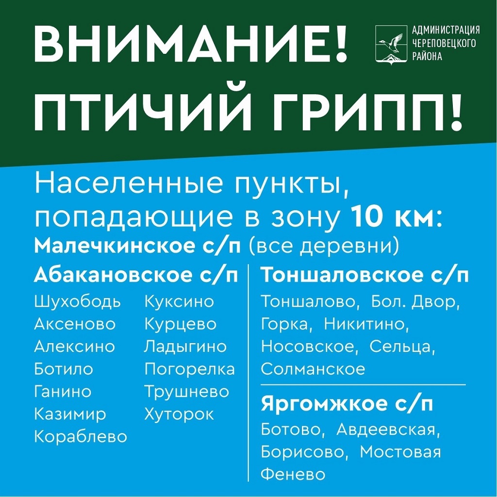 Об этом сообщил руководитель администрации Череповецкого района Роман Маслов. В связи с высокопатогенным гриппом птиц, который обнаружен на Малечкинской птицефабрике, карантин установлен на территории в десять километров.