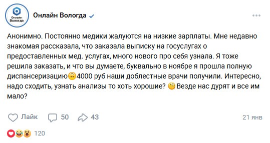 «Мне недавно знакомая рассказала, что заказала выписку на госуслугах о предоставленных медицинских услугах и много нового про себя узнала. Я тоже решила заказать – и что вы думаете? Буквально в ноябре я прошла полную диспансеризацию. 4 тысячи рублей наши доблестные врачи получили. Интересно. Надо сходить и узнать, анализы-то хоть хорошие? Везде нас дурят – и всё им мало», — написала в соцсетях одна из жительниц областной столицы.