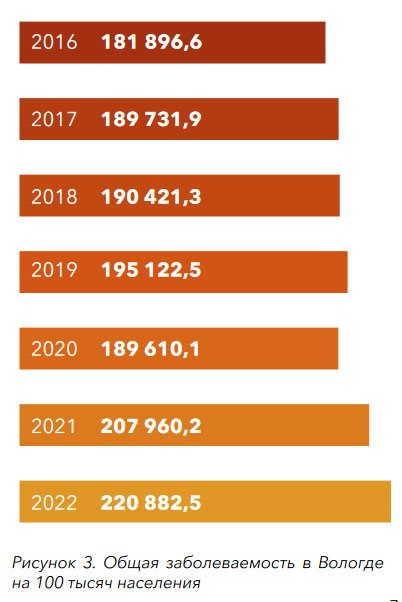 Общий уровень заболеваемости вологжан рос на протяжении нескольких лет. В 2020 году наблюдалось снижение уровня заболеваемости, а в 2021 и 2022 годах снова произошёл рост заболеваемости, что связано прежде всего с распространением коронавирусной инфекцией», — отмечается в докладе «Профиль здоровья города Вологды»,который опубликовала администрация областной больницы.