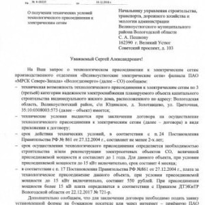 - письмо МРСК на подключение к линии электропередач на 15 кВТ