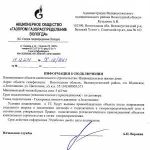 - письмо Газпрома на подключение природного газа на 5 куб. м в час